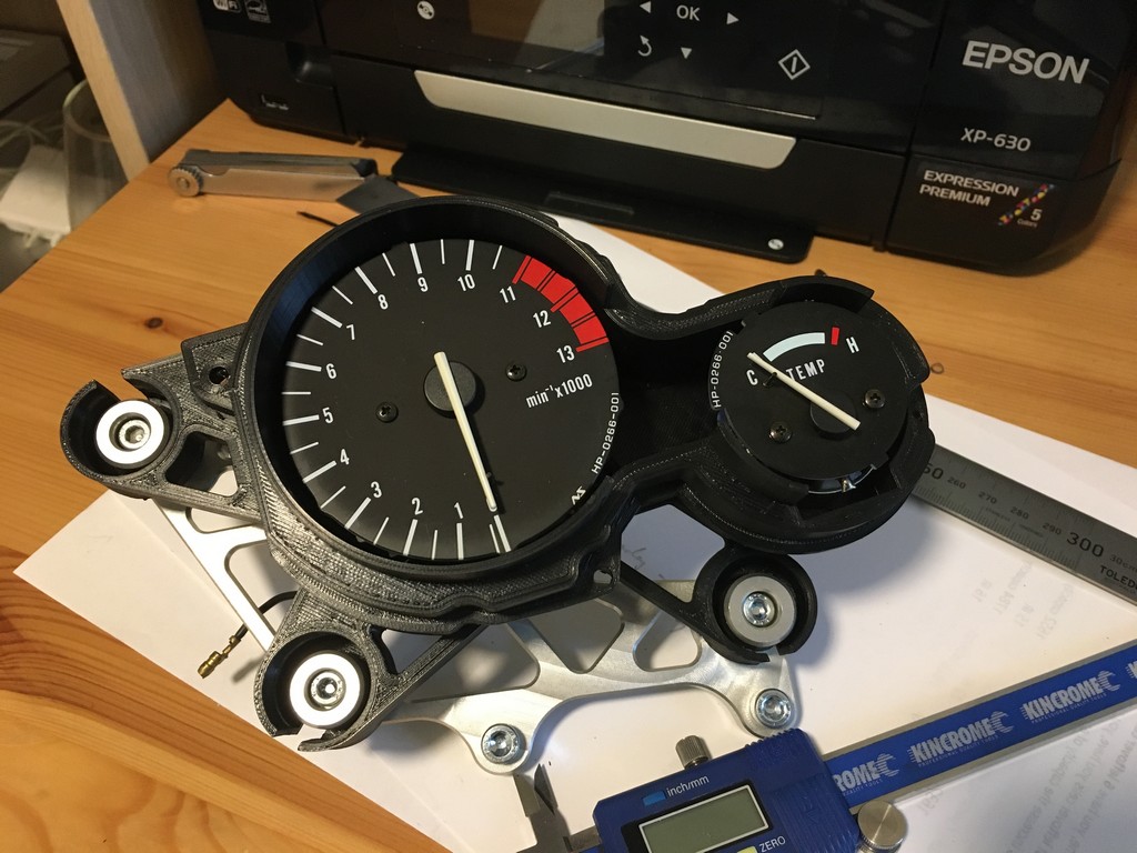 We thought it’d be a good idea to have a spare set of instruments so we sourced a second set of gauges. This set was from a 1993 Fireblade so we assumed the back cover would be the same…wrong! The gauges looked the same from the front but the rear mounting was completely different. Since we had already machined two mounting brackets and also that these instrument sets were a bit thin on the ground we decided to keep the ’93 instruments and print a new back cover that would suit the existing mounting bracket.