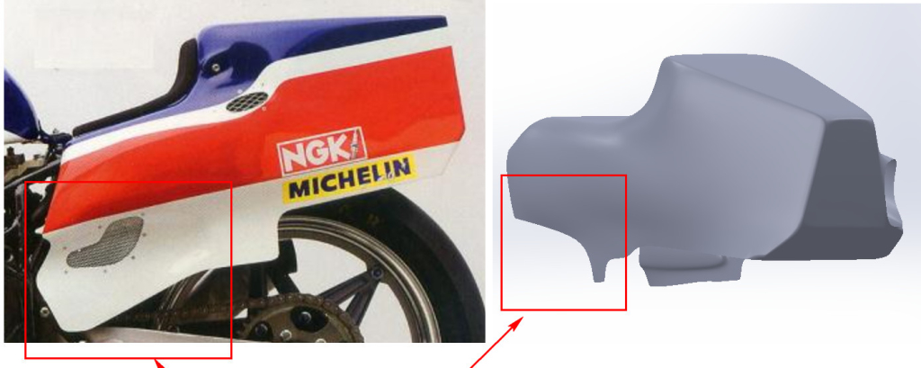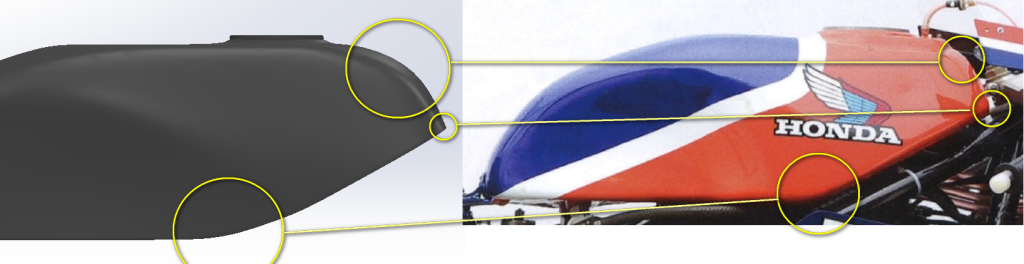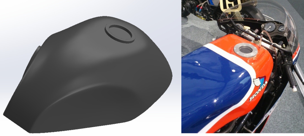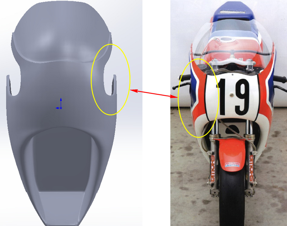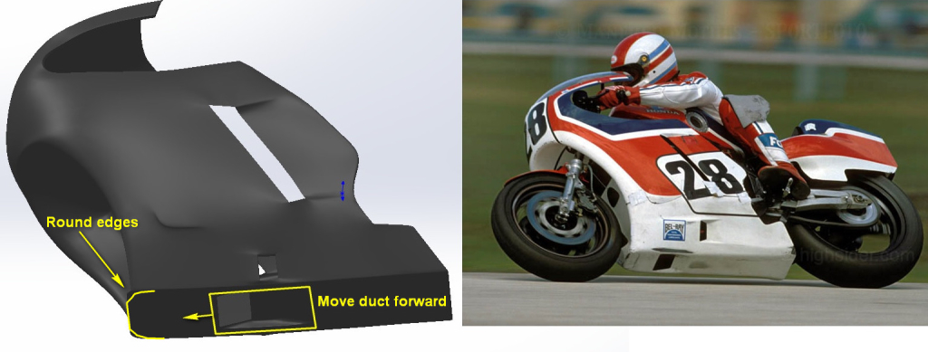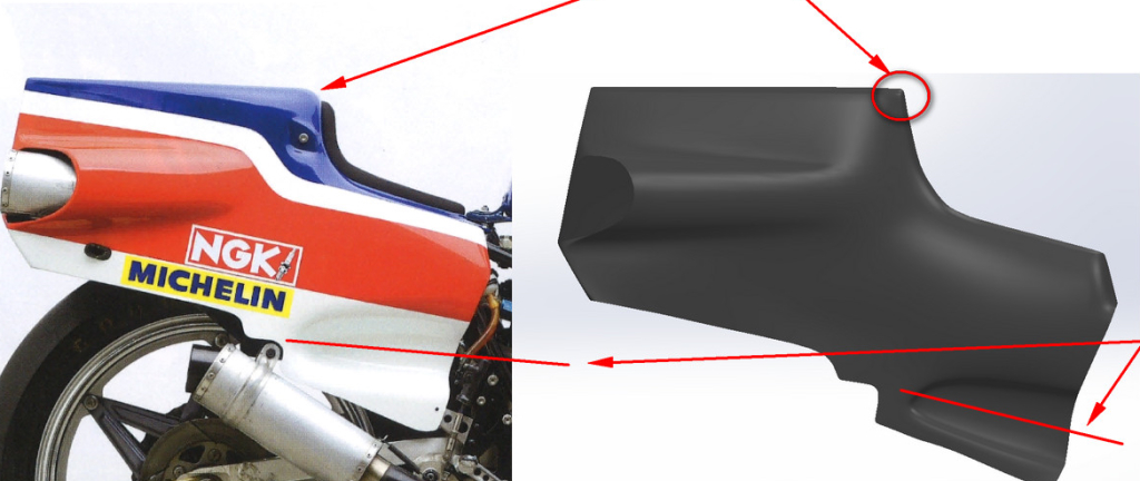 The snub nosed fairing is narrow and hugs the chassis as allowed by the slim V4 engine layout. The front duct is open only for the inverted ‘U’ shaped radiator, an oil cooler in the chin and a small access hole in the centre panel. The radiator exhaust ducting on each side is asymmetrical for reasons unknown to me. The front of the fuel tank is broad and hunched over the triple clamps. Its lines taper rearwards to a narrow finish allowing the rider plenty of room. The seat unit features scalloped and bulbous side panels, cooling vents and a muffler outlet on the right hand side to accommodate the snaking pipes of the rear cylinder bank exhaust system. The process of designing and manufacturing the bodywork parts we undertook was as follows.
