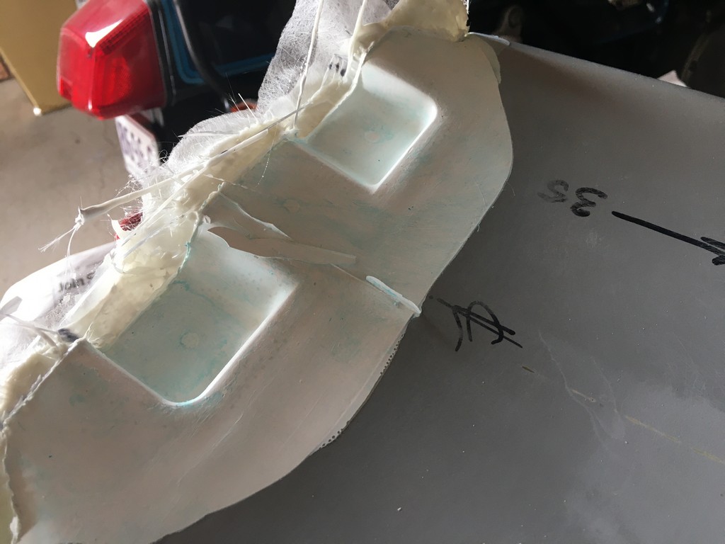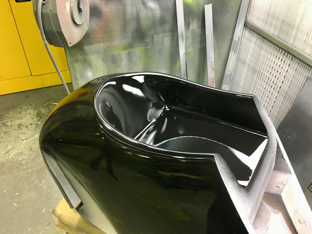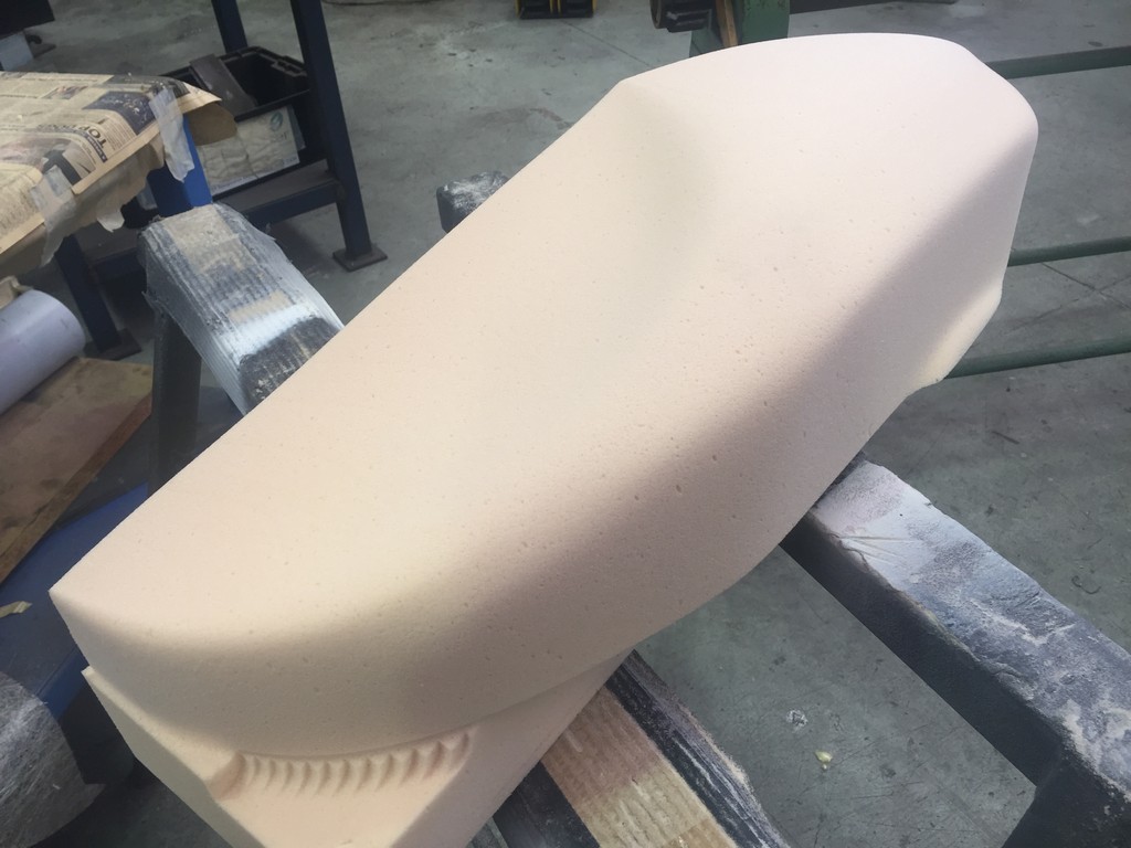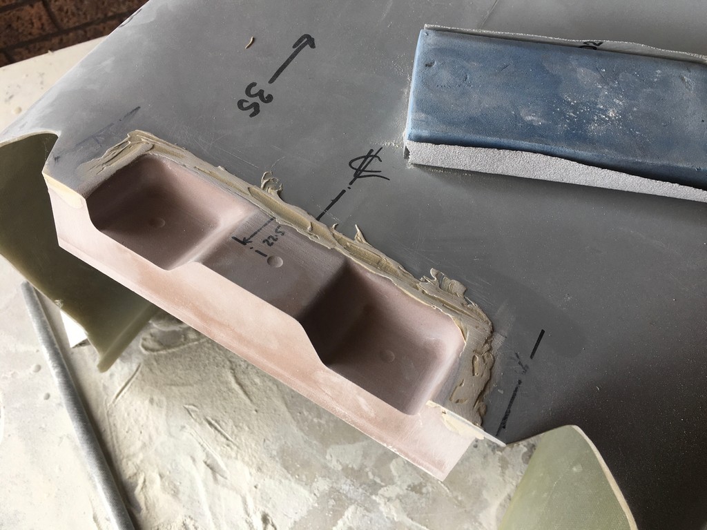 However, we have come so far and made such an effort to maintain fidelity with the original appearance we just couldn’t let it go. The dimensions of the mount detail was worked out and a piece of tooling board machined to replicate it. We then cut out the section of the newly made fibreglass seat and bonded the tooling board into position. The seat was remounted in it’s mould and the mould modified to include the mount detail. From there it was a simple case of re-glassing that section of the seat to include the mount recesses.
