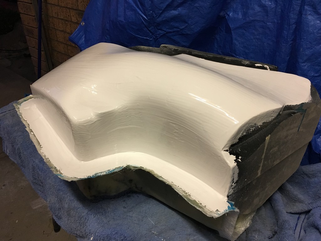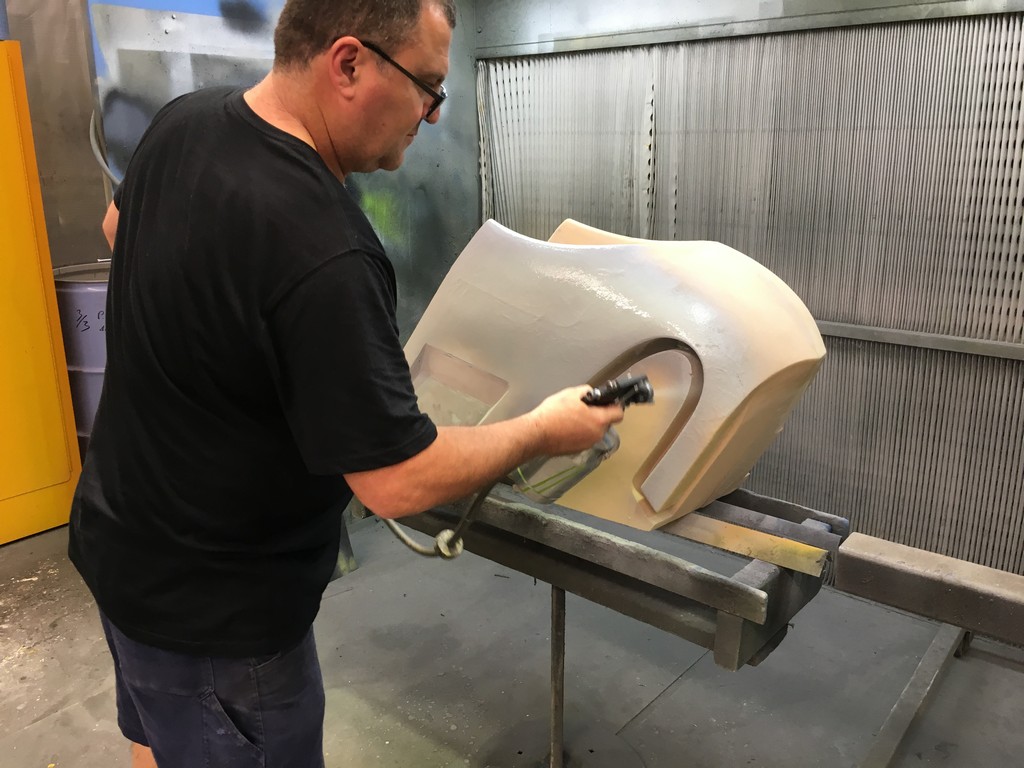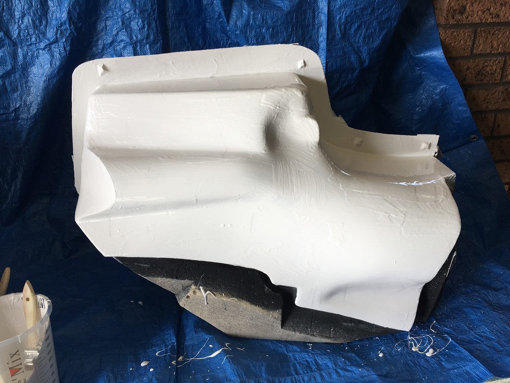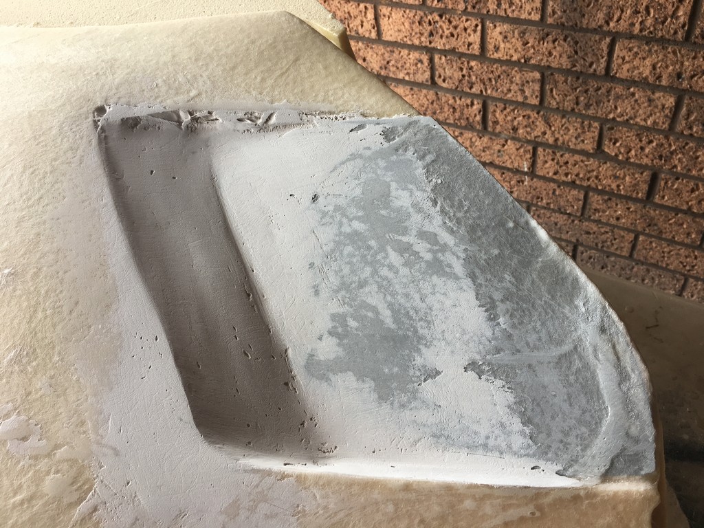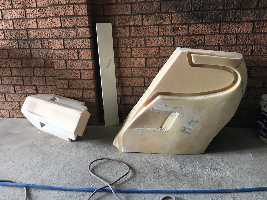 The quality of the surface finish of the final parts is highly dependant upon the quality of the plugs. To obtain a high quality finish the plugs were coated with a layer of fibreglass surface tissue and polyester resin. This provided a hard skin over the relatively soft foam which made the plugs easier to work with. At this point the fine details of the plugs were refined with lots of hand shaping, sanding, filling, priming and painting. I should emphasise lots and lots of shaping, sanding, filling, priming and painting. It was a very laborious, tedious and dusty part of the project but at the same time a critical part that had to be done right.